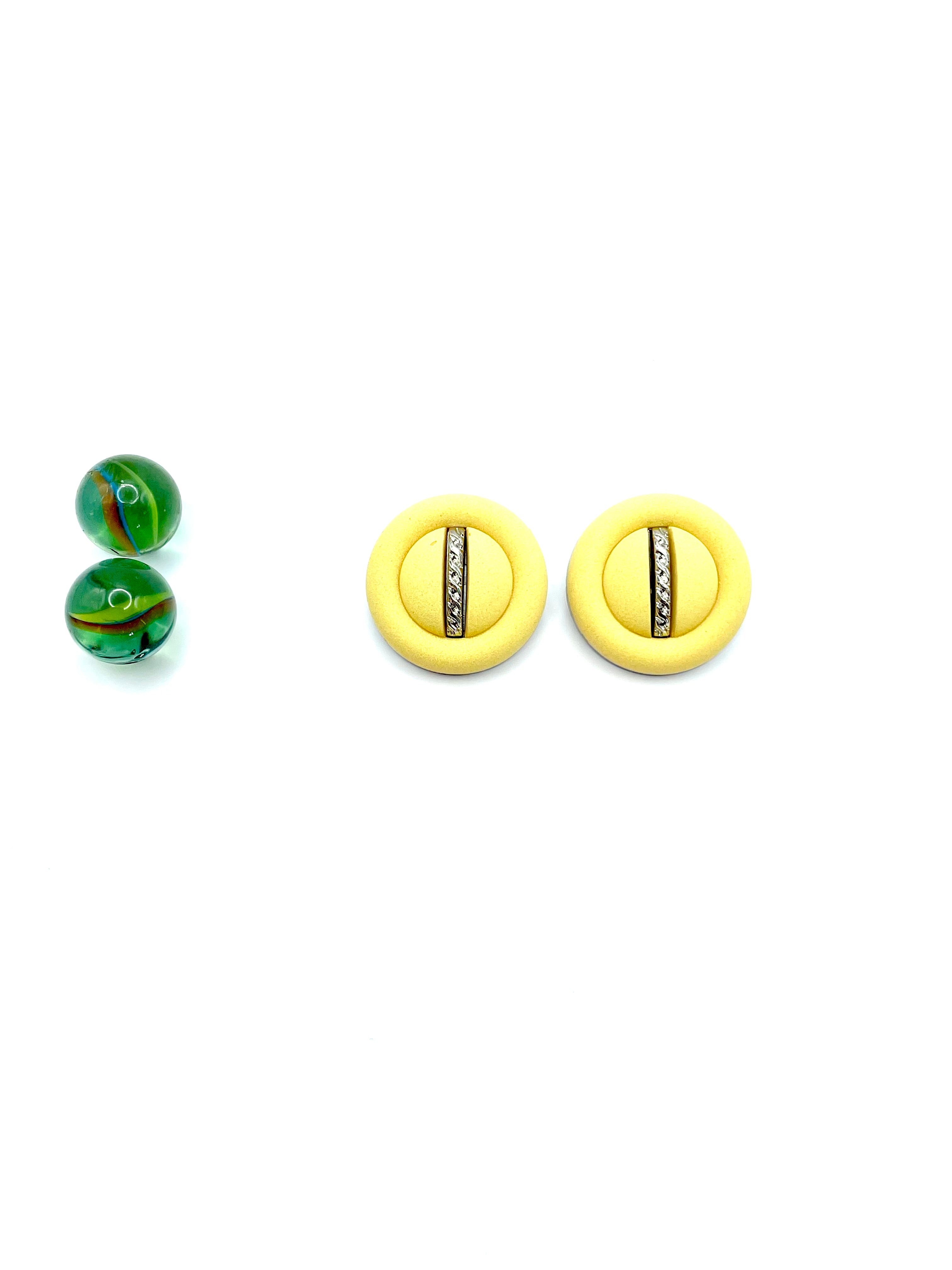 Χειροποίητα καρφωτά σκουλαρίκια κατασκευασμένα από κουμπιά με vintage αισθητική σε χρώμα ασημί / κίτρινο ανοιχτό. Το κυρίως σώμα (κουμπιά) είναι από υψηλής ποιότητας πλαστικό ενώ τα καρφάκια είναι από ανοξείδωτο επιχρυσωμένο ατσάλι (stainless steel).