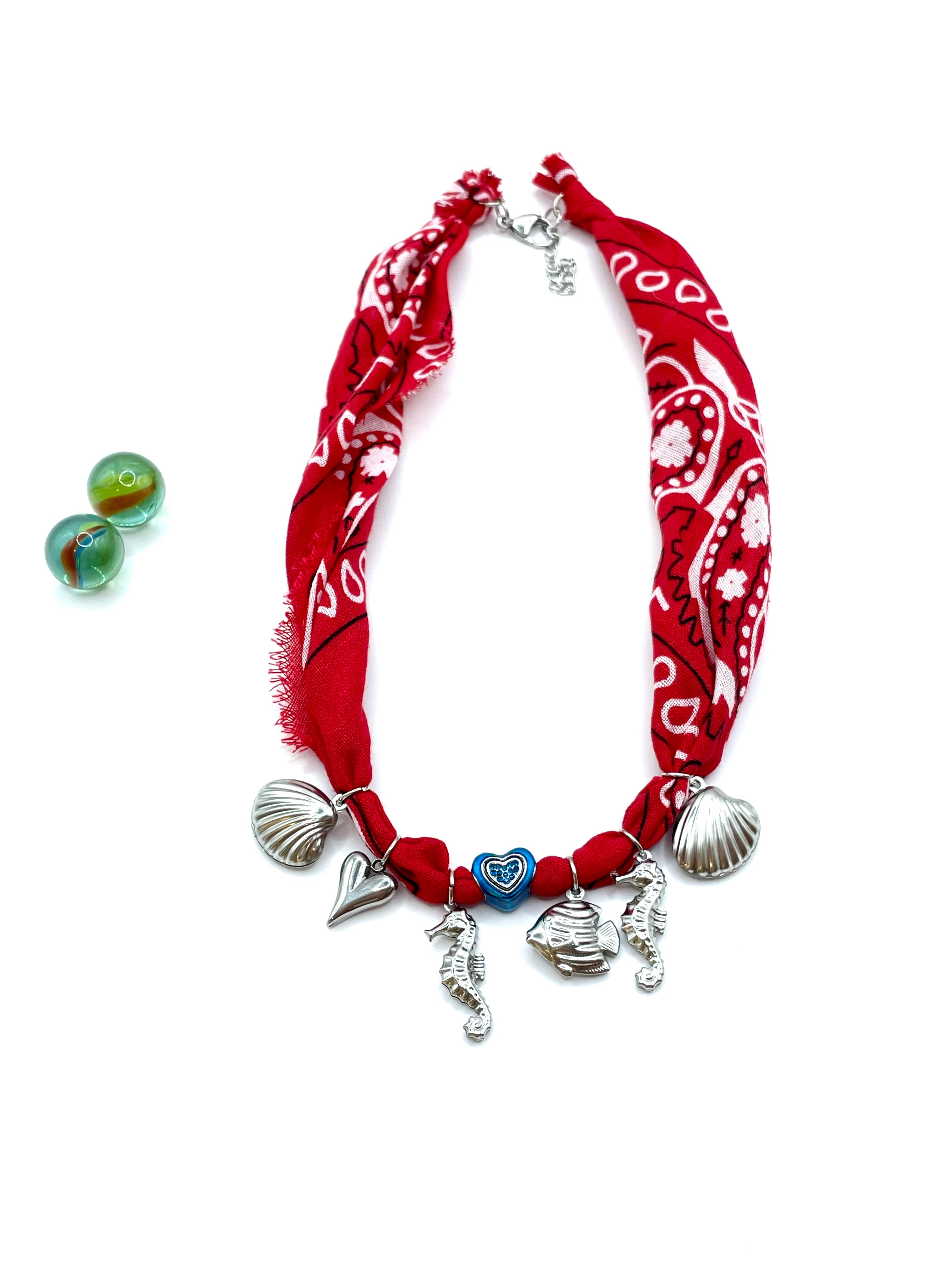 BANDANA NECKLACE RED / SILVER CHARMS ( ST.STEEL )