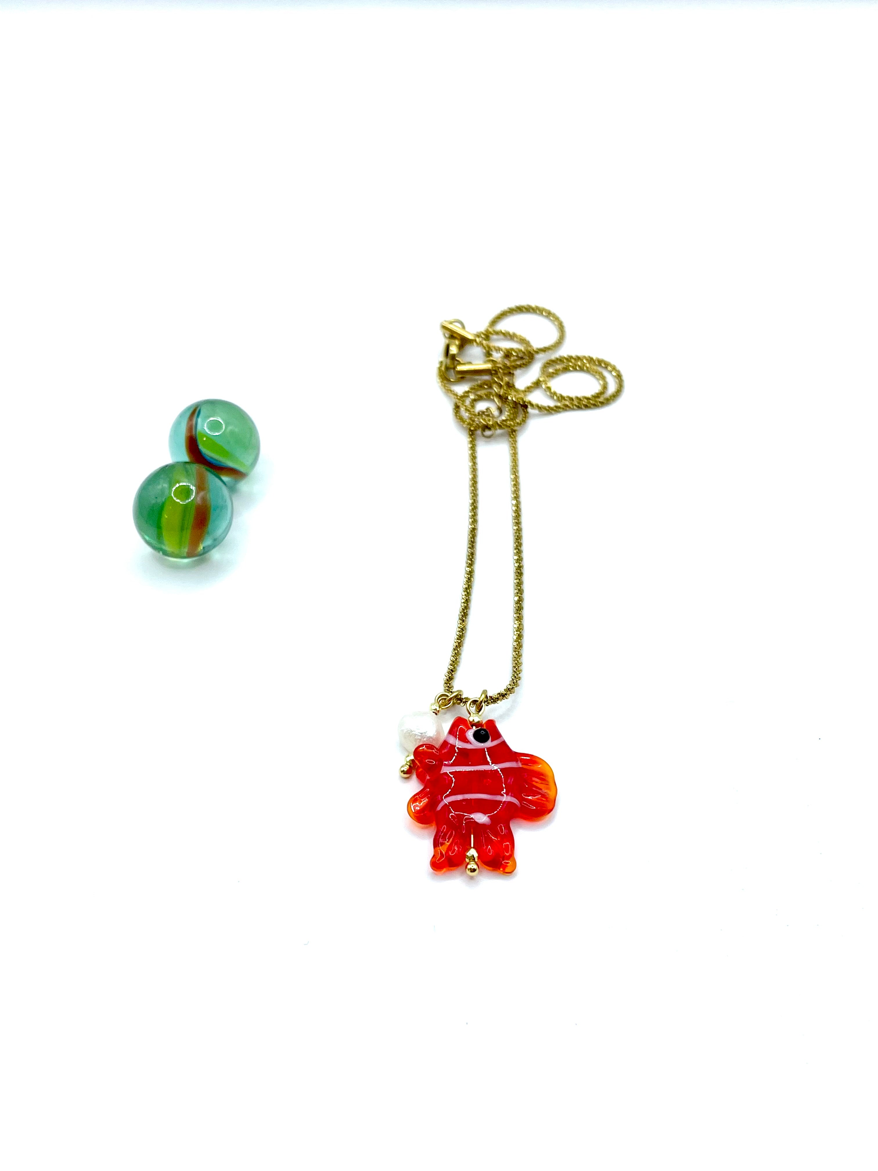 χειροποίητο κολιέ από ατσάλινη αλυσίδα ( stainless steel ) , επίχρυση ή επάργυρη , κρεμαστό μικρό μαργαριταράκι καλλιέργειας ( freshwater pearl ) & κόκκινο ''ψαράκι'' από φυσητό γυαλί (blown glass ) , την ''μπαρμπούνα'' μας .