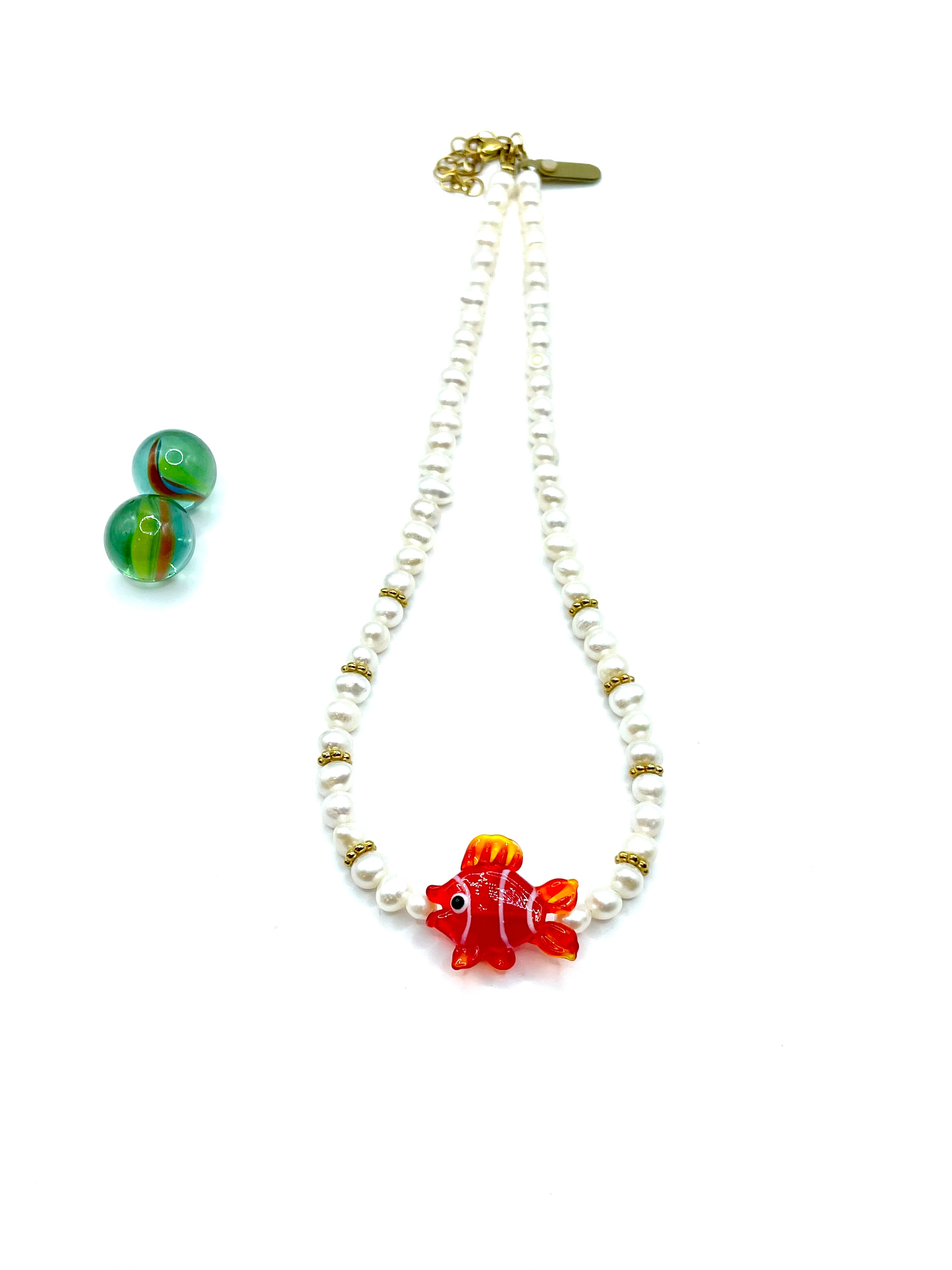 χειροποίητο κολιέ από λευκά μαργαριτάρια καλλιέργειας (freshwater pearls) και κόκκινο ''ψαράκι'' από φυσητό γυαλί (blown glass ) , την ''μπαρμπούνα'' μας . Όλα τα συνδετικά στοιχεία είναι από επιχρυσωμένο (18Κ) ανοξείδωτο υποαλλεργικό ατσάλι ( stainless steel ) .