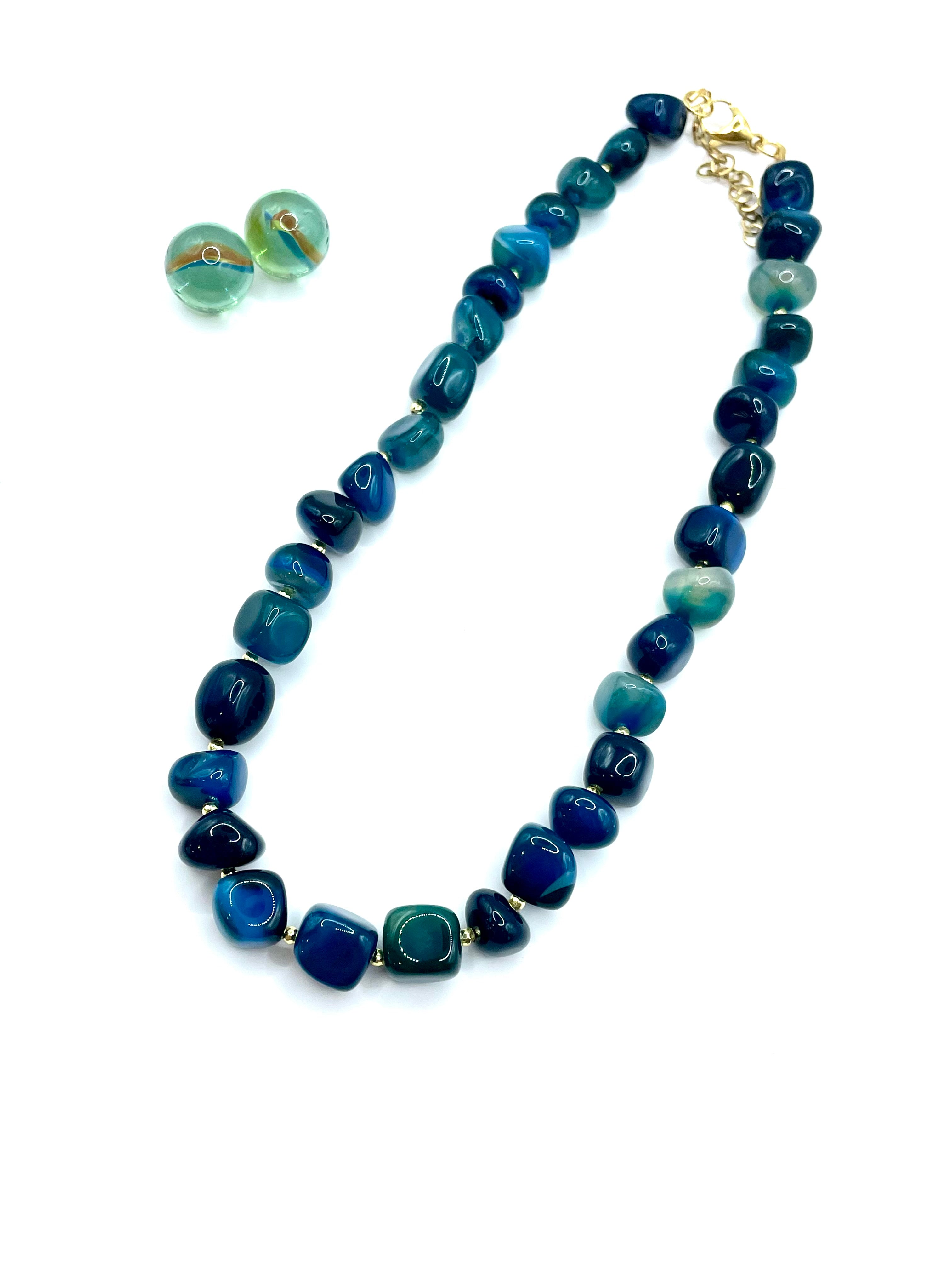 Χειροποίητο κολιέ από ημιπολύτιμες πέτρες πετρόλ νεφρίτη (jade) σε ακανόνιστο σχήμα και χρυσό αιματίτη .