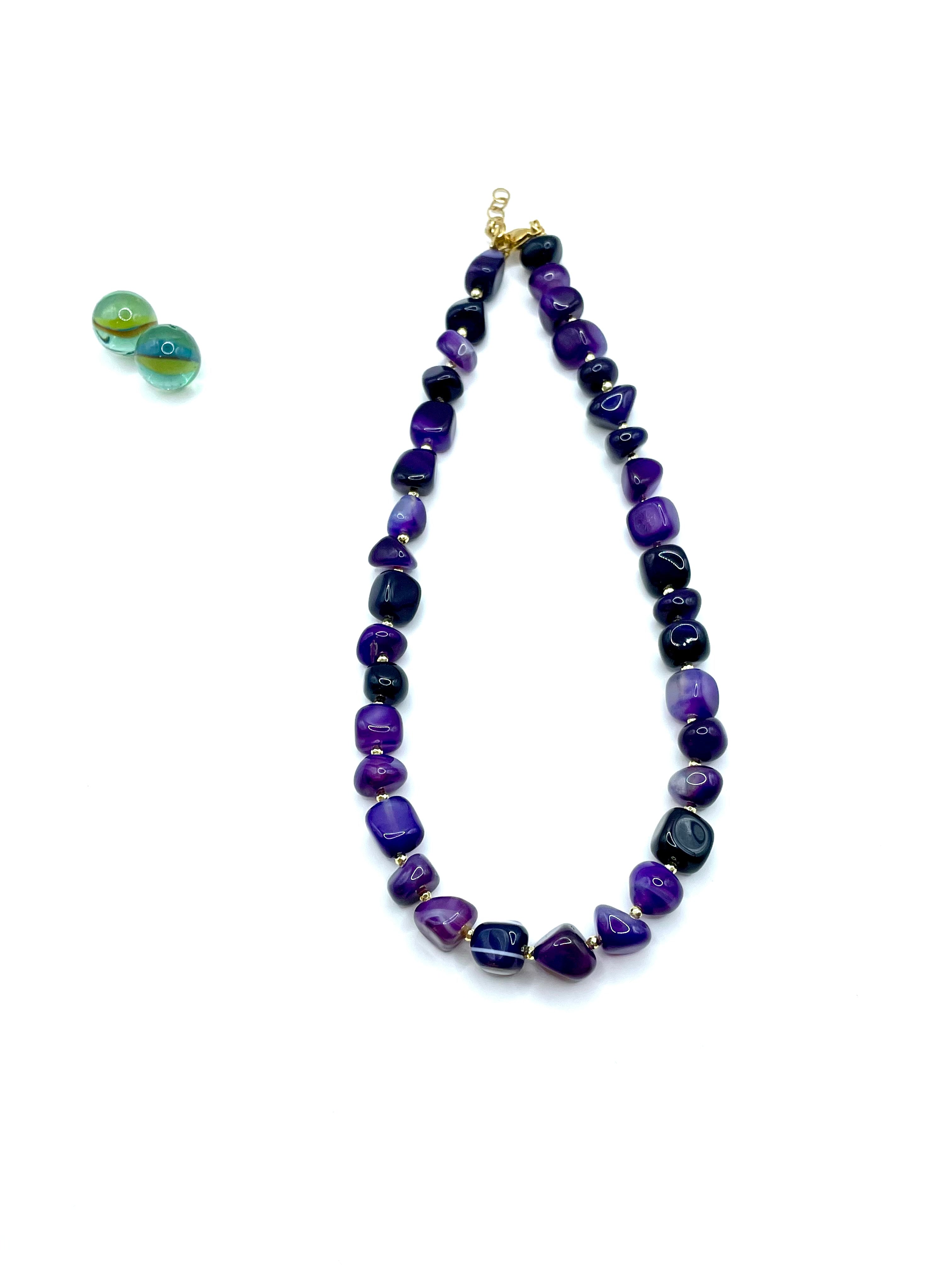 Χειροποίητο κολιέ από ημιπολύτιμες πέτρες μοβ νεφρίτη (jade) σε ακανόνιστο σχήμα και χρυσό αιματίτη .
