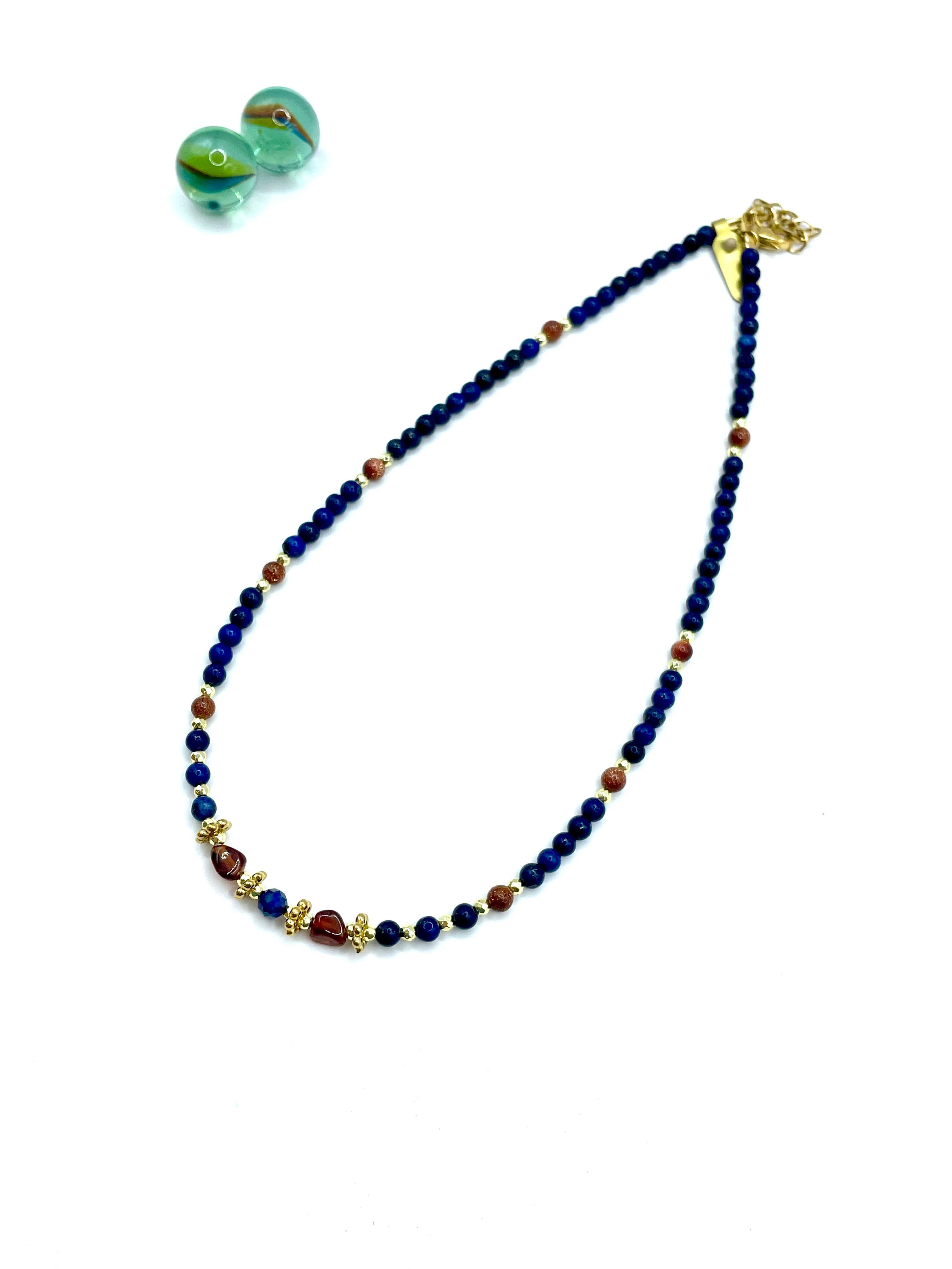 Χειροποίητο κολιέ από ορυκτούς λίθους λάπις λάζουλι ( lapis lazuli ) , χρυσόλιθο ( goldstone ) χρυσό αιματίτη και κορνεόλη ( carnelian )