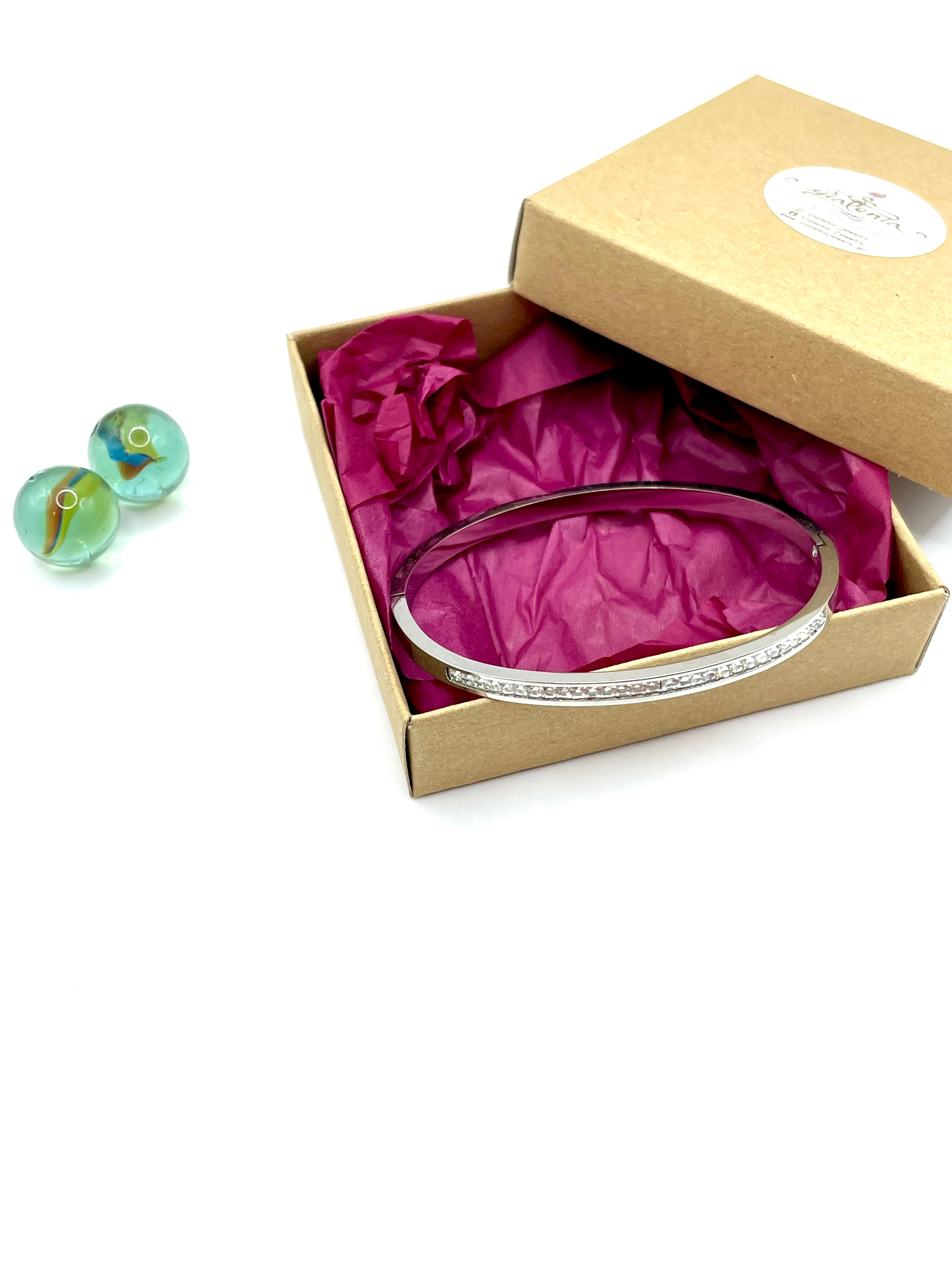 βραχιόλι / χειροπέδα σε minimal γραμμή , από ανοξείδωτο υποαλλεργικό ατσάλι 316L ( stainless steel 316L) , με λευκά στρας .