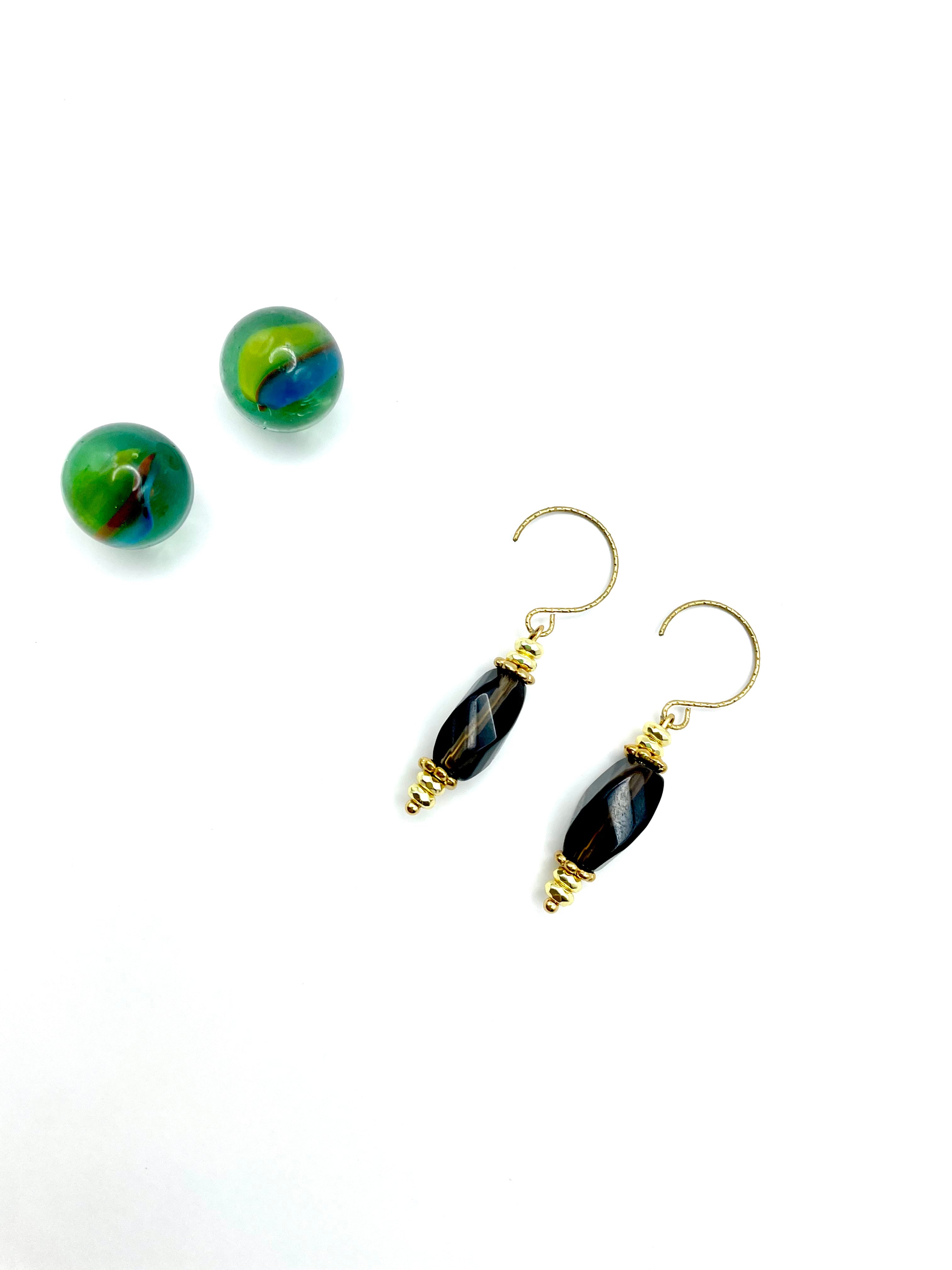 Κρεμαστά χειροποίητα σκουλαρίκια από ορυκτούς λίθους καπνία ( smoky quartz ) , ημιπολύτιμες πέτρες χρυσού αιματίτη και συνδετικά στοιχεία από επιχρυσωμένο (18Κ) ανοξείδωτο υποαλλεργικό ατσάλι ( stainless steel ) .