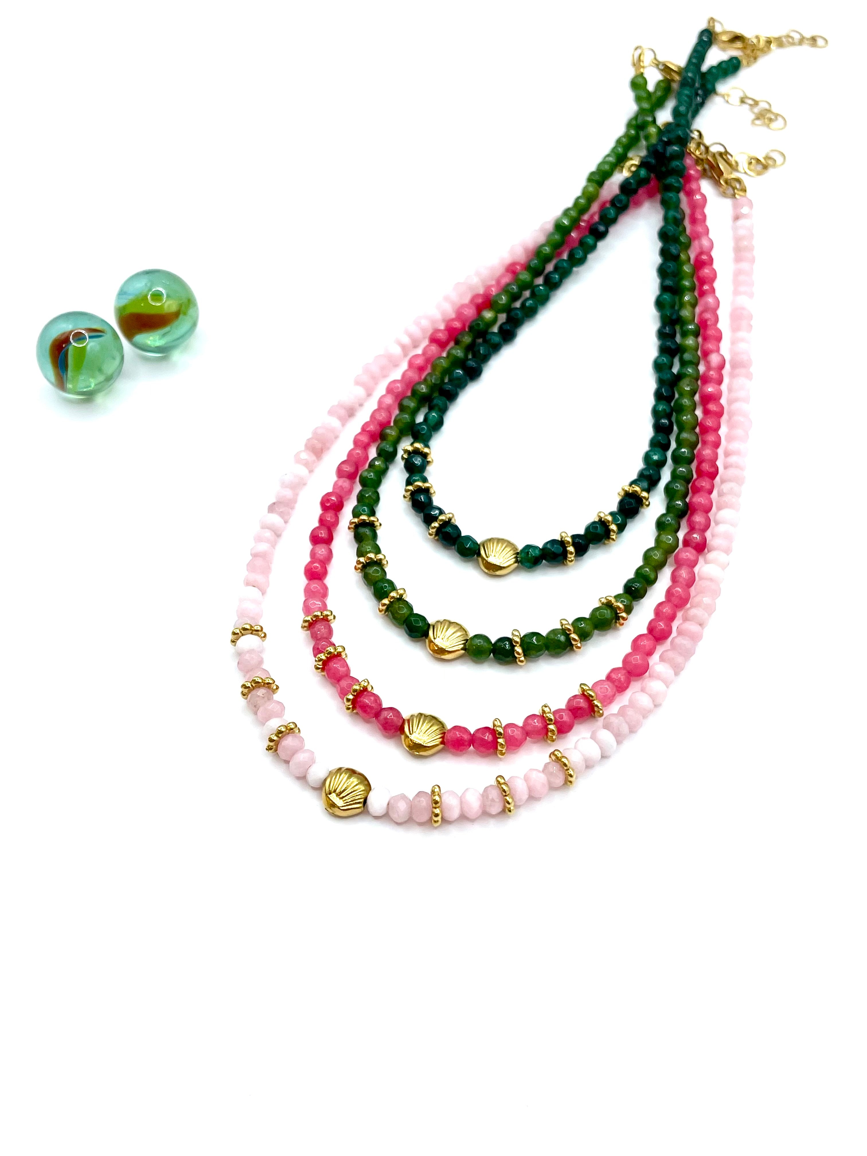 χειροποίητο κολιέ από ορυκτούς λίθους νεφρίτη (jade) σε 10 διαφορετικά χρώματα & ατσάλινο μικρό μικρό ''κοχυλάκι / αχιβάδα '' επιχρυσωμένο 18Κ ( stainless steel ) .