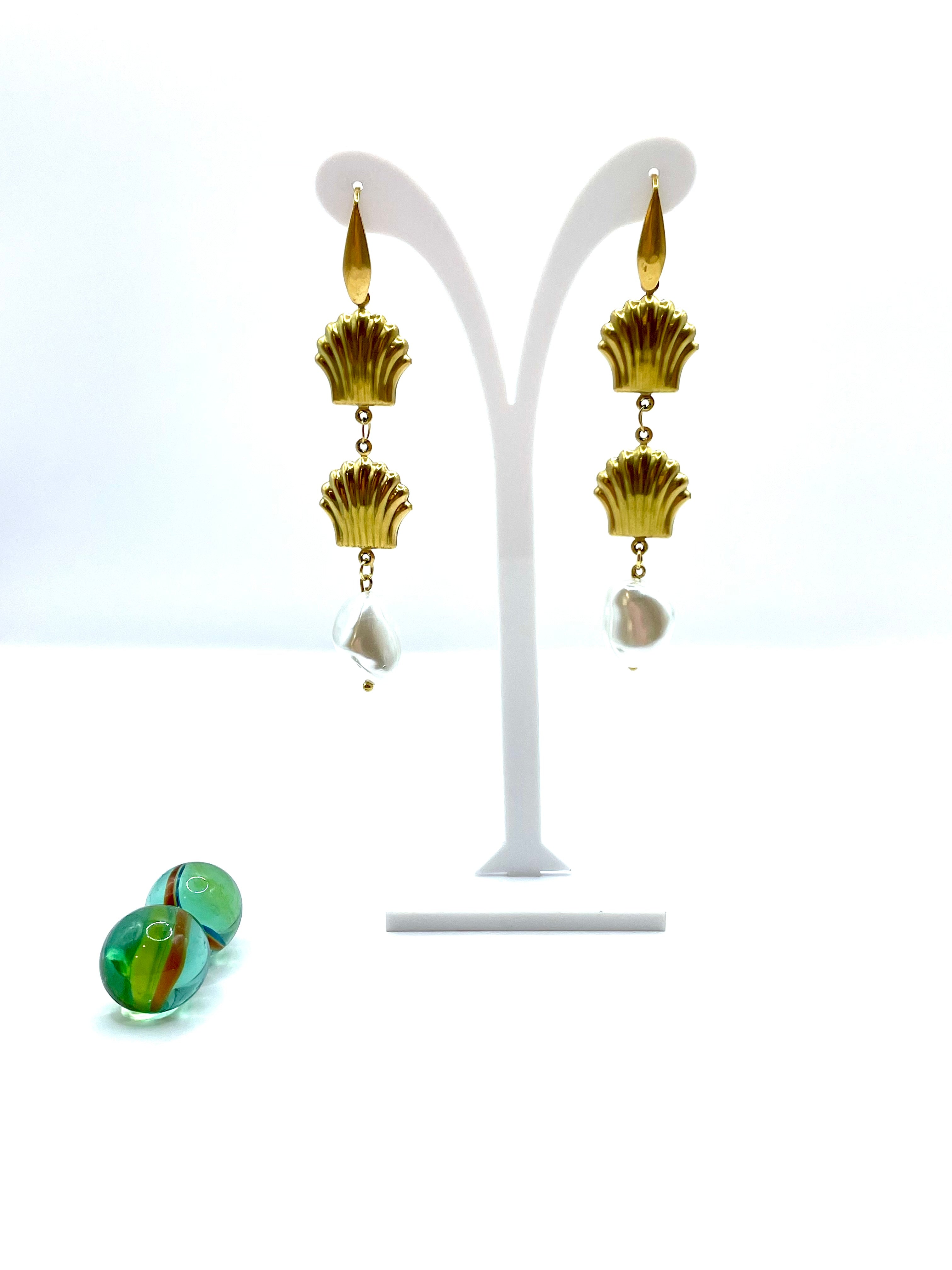 Κρεμαστά σκουλαρίκια από ατσάλινα επιχρυσωμένα (18Κ) γατζάκια , ''κοχύλια'' από επιχρυσωμένο ανοξείδωτο ατσάλι ( stainless steel ) και ακανόνιστες baroque φυσικές πέρλες από όστρακο (shell pearl) σε λευκό χρώμα.